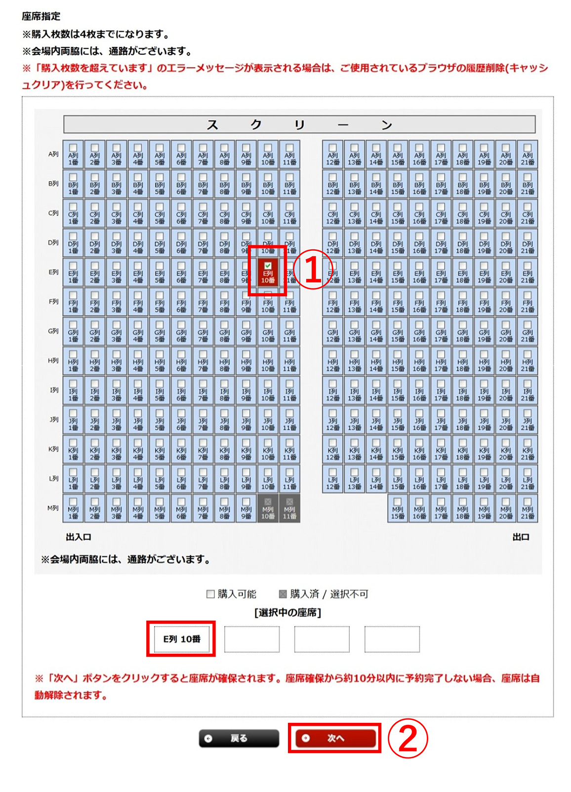 ※ご希望の席がない場合は、ページ下部の[戻る]ボタンを押すと「上映日時指定」画面に戻りますので、再度、上映日カレンダーから日付を選択してください。