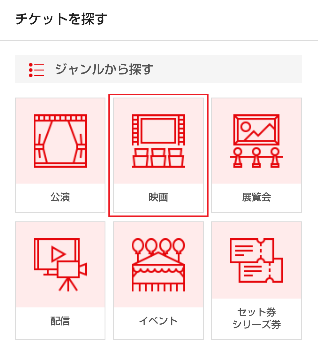 各作品の情報ページに表示のオンライン購入ボタンまたは、オンライン予約TOPページの≪ジャンルから探す≫より「映画」を選択してください。