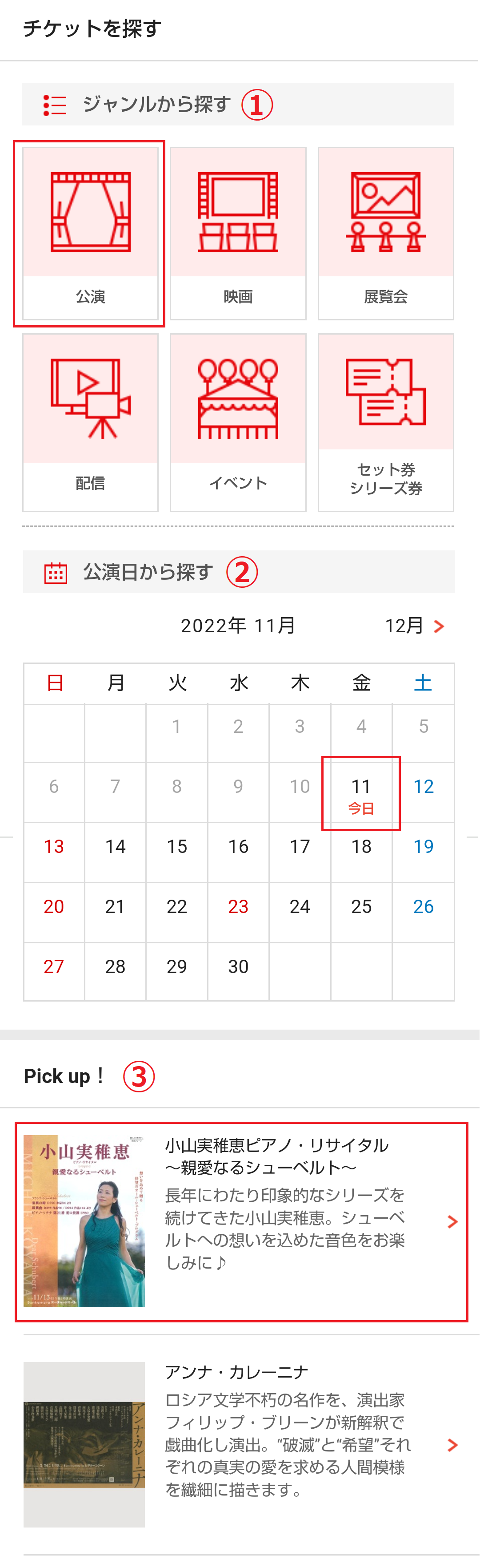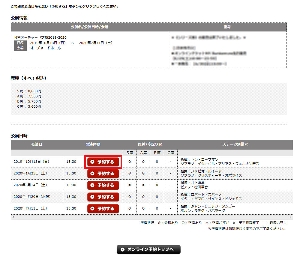 各公演の情報ページに表示のオンライン購入ボタンまたは、オンライン予約TOPページの各メニューより希望公演の検索ができます。