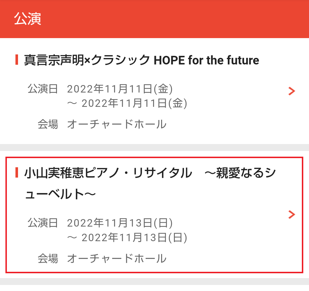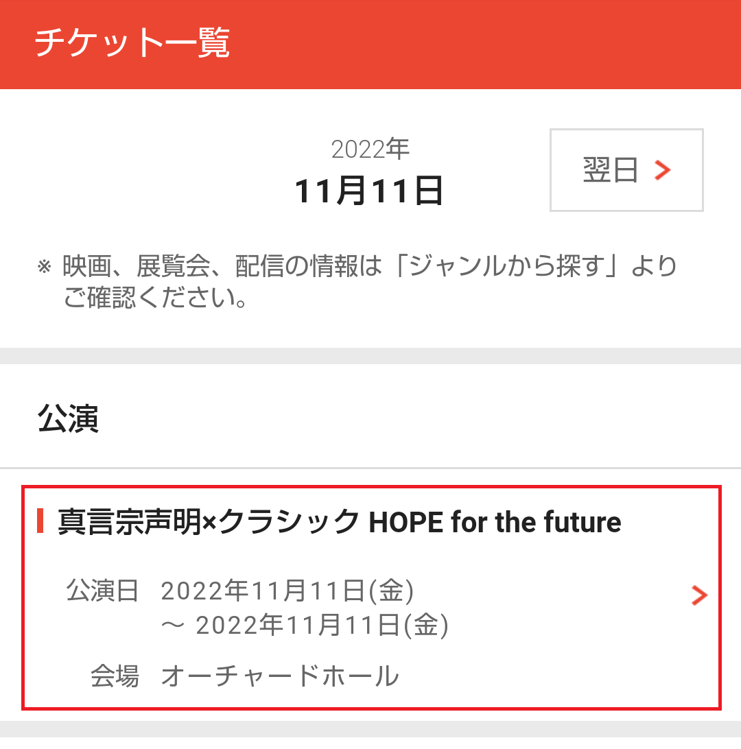 それぞれのジャンルごとに、取扱いチケットの一覧が開催日順で表示されます。希望する演目を選択してください。