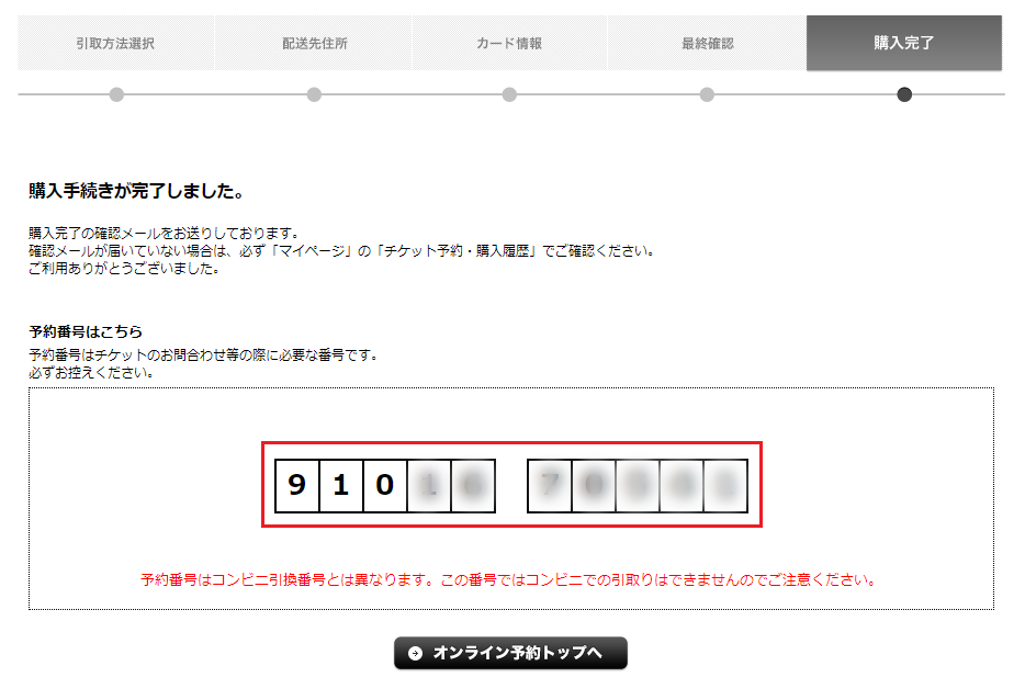 以上で購入のお手続きは完了です。ご登録のメールアドレス宛に、「購入完了のお知らせ」のメールが届きます。メールが届かない場合は、必ずマイページの「購入履歴」よりご確認ください。「予約番号」はお問合せの際に必要ですので、お控えください。