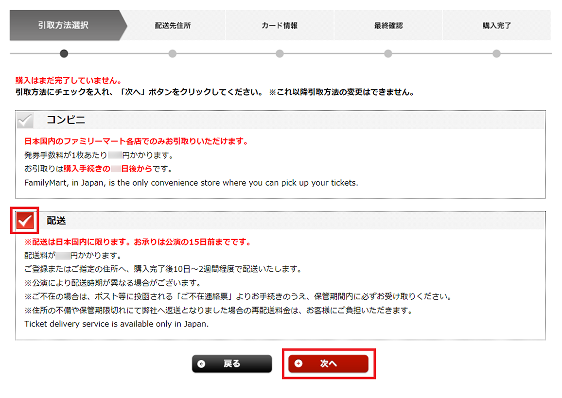 引取方法選択画面にて「配送」にチェックマークを入れ選択し、[次へ]ボタンを押してください。