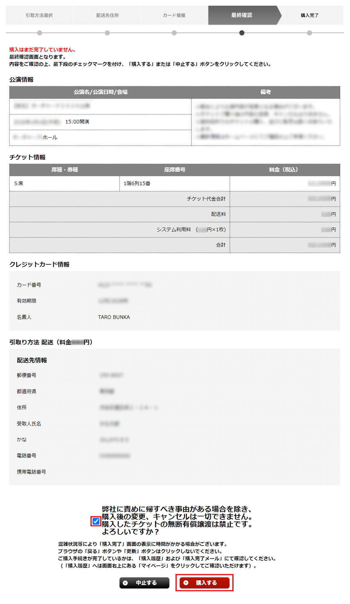 購入内容をご確認のうえ、間違いがなければ「購入後の変更、キャンセルは一切できません。よろしいですか?」のチェックボックスにチェックを入れて[購入する]ボタンを押してください。